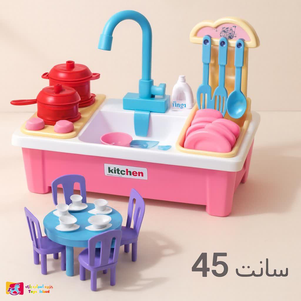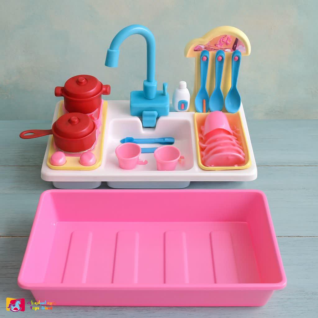 سینک ظرفشویی همراه آویز قاشق و چنگال یک اسباب بازی مهیج و سرگرم کننده است که کودک با شستشوی ظروف حس خوبی را تجربه می کند. با ریختن آب داخل سینک و چرخاندن شیر آب، پمپ آب که توسط دو عدد باتری 1.5 ولت تغذیه می شود روشن شده و آب را از دهانه شیر آب سرازیر می کند و کودک می تواند با قرار دادن ظروف که داخل بسته بندی قرار دارد ، شروع به شستن آنها کند.