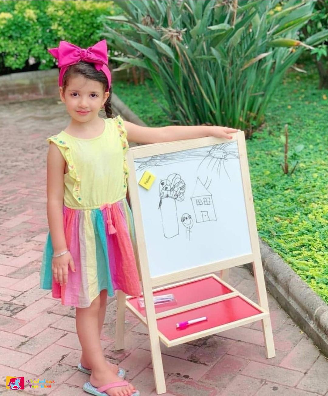 تخته دو طرفه تا شو مگنتی در يک طرف داراي تخته سياه مي باشد؛ که کودکان مي توانند با استفاده از گچ رنگي داخل جعبه روي آن نقاشي کنند يا هرچه دوست دارند يادداشت کنند؛ در طرف ديگر تخته وايت برد مگنتي مي باشد؛ يک عدد ماژيک و تخته پاک کن  نيز داخل جعبه مي باشد. تخته دوطرفه چوبي بوده و داراي يک ميز در وسط آن که جنس چوبی دارد براي نگهداري وسايل مي باشد و يک وسيله عالي براي سرگرمي و آموزش کودکان مي باشد. بهترين زمان براي پرورش خلاقيت و مهارت انسان ها در کودکي مي باشد و هرچقدر شما کودکتان را براي انجام کارها آزاد بگذاريد و پر و بال به او بدهيد؛ در آينده فرزندي خلاق خواهيد داشت.