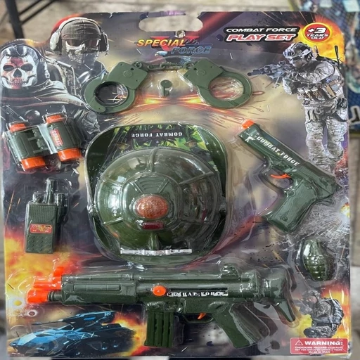 ست تفنگ با کلاه مدل کماندو یک پک کامل است از وسایل یک سرباز کماندو می باشد که در جنگ علیه دشمن نیاز دارد. این ست شامل تفنگ اسباب بازی یوزی، تفنگ کلت اسباب بازی ،کلاه ، بی سیم ، دستبند ، بیسیم ، دوربین و یک مدل می باشد که برای کودکان بسیار جذاب است.