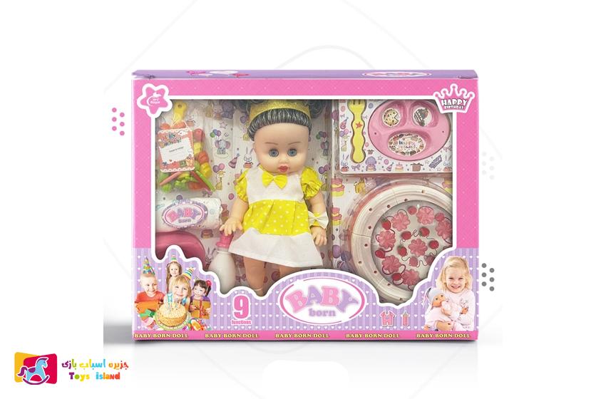 خانهنقش آفرینیدخترانه عروسک بی بی بورن گوشتی موزیکال با کیک و ست لوازم تولد