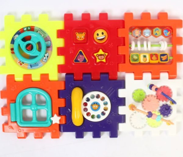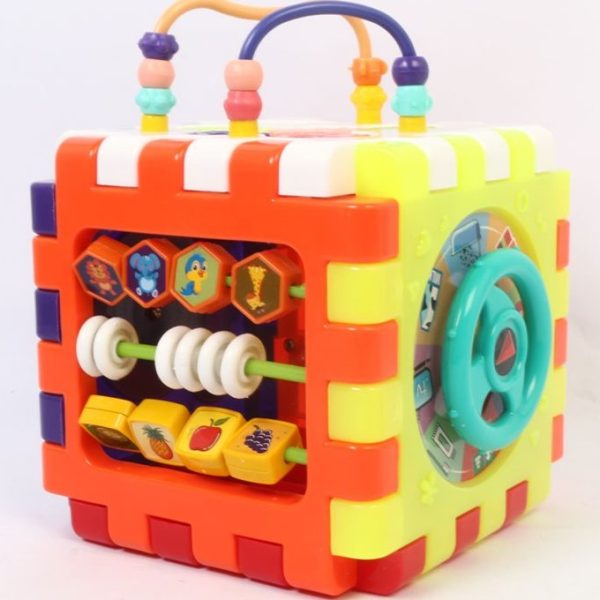 بر روی مکعب چند وجهی اجزای رنگی مختلفی مانند چرخ دنده، میله و حلقه های رنگی و … وجود دارد که کودک می تواند آن ها را حرکت دهد و یا بچرخاند. این مکعب دارای بازی های مختلف می باشد از جمله بازی اشکال پازلی که می توانید از کودک بخواهید هر کدام از اشکال پازلی موجود در بسته بندی را که دارای شکل های متفاوتی نیز هستند از طریق حفره های موجود روی بدنه مکعب که شکل همان قطعه پازل است درون مکعب بیاندازد، سپس با باز کردن پنجره آن ها را از مکعب خارج نماید.