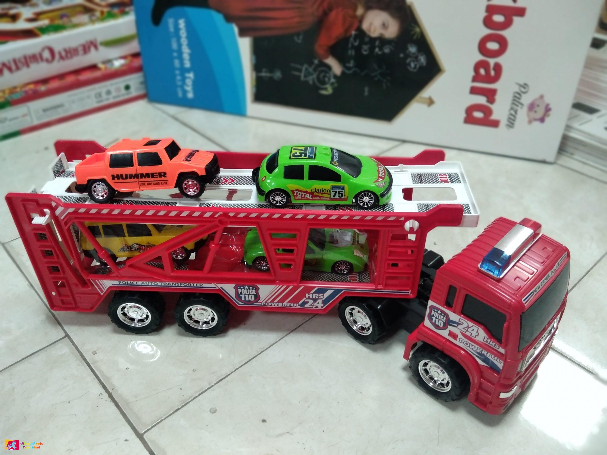 تریلی حمل خودرو پلیس اسباب بازی، یک مجموعه پنج عددی از ماشین‌های بازی است. شما و فرزندانتان می‌توانید به‌طور همزمان از پنج محصول استفاده کنند. یک تریلی بزرگ زیبا در ابعاد 75x25x21 سانتی متر و چهار ماشین ماشین سواری که بر روی تریلی قرار دارد. جنس این ماشین‌های اسباب بازی از پلاستیک مواد نو است و وزن زیادی ندارد، پس بازی کردن با آن را برای فرزندان شما بسیار آسان‌ و دلچسب می‌کند. این محصول به صورت دستی کار می‌کند و چرخ های آن به صورت قدرتی است که برای تقویت قدرت تحرک و همچنین قوه‌ی تخیل کودکان شما بسیار مفید است. شما از این محصول می‌توانید در هر مکانی و بدون هبچ محدودیتی استفاده کنید.